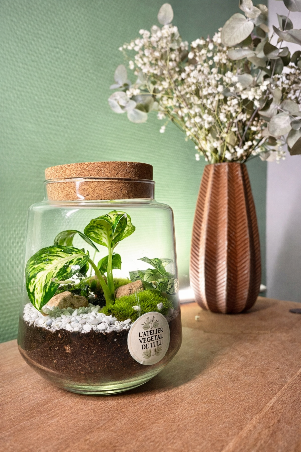 Un terrarium harmonieux et stable, pensé pour instaurer une atmosphère douce et équilibrée. Une création idéale pour les intérieurs calmes et chaleureux.