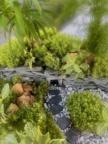 Un chemin discret traverse la mousse et la végétation, comme une invitation à ralentir et à observer chaque détail du paysage miniature.