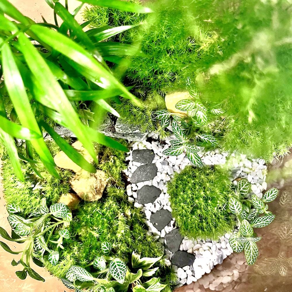 Un terrarium signature inspiré des jardins cachés, où un chemin minéral invite à la contemplation et au calme. Une création idéale pour apporter une présence végétale élégante et apaisante à un salon ou un espace de vie lumineux.