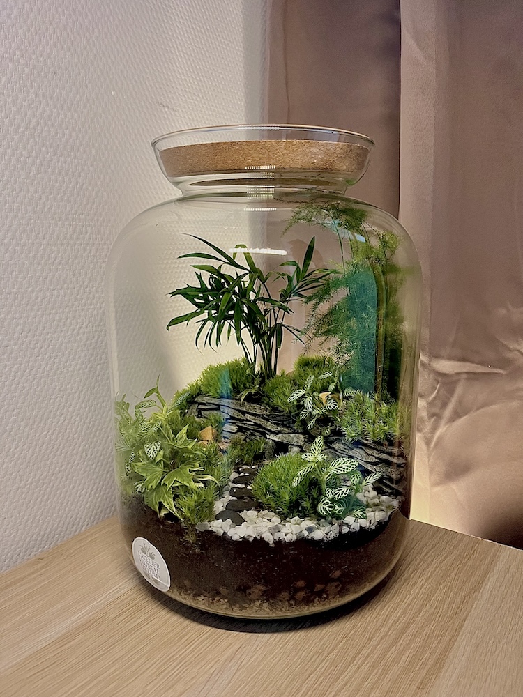 Pensée comme une pièce décorative végétale, cette création Signature trouve naturellement sa place dans un salon, une bibliothèque ou un bureau lumineux. Son équilibre végétal en fait également une idée de cadeau végétal original, durable et facile à intégrer dans la vie quotidienne, même pour ceux qui découvrent l’univers des terrariums.