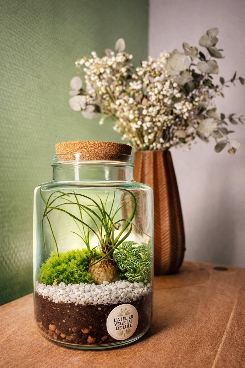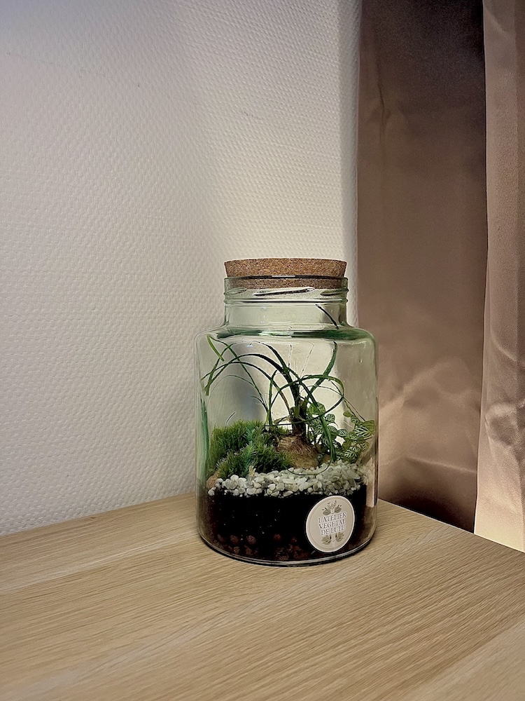 Il s’intègre facilement dans un salon, un bureau ou une étagère lumineuse, et convient parfaitement à celles et ceux qui recherchent un terrarium facile d’entretien. Sa présence douce en fait également une idée de cadeau végétal originale, idéale pour offrir un fragment de nature durable et apaisant.