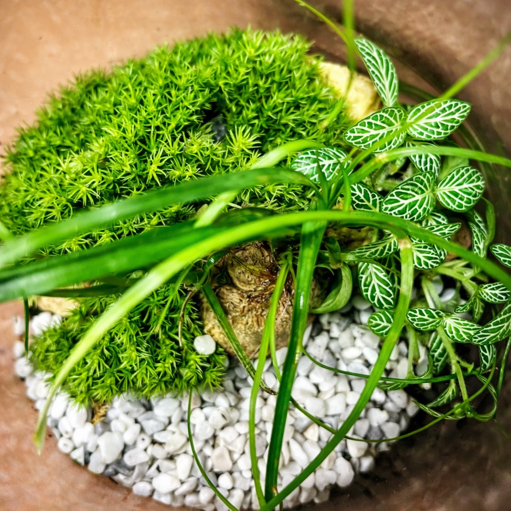 Un terrarium clair et lumineux, pensé comme une pause végétale discrète et élégante. Une création idéale pour apporter douceur et sérénité à un salon, un bureau ou un espace de vie.