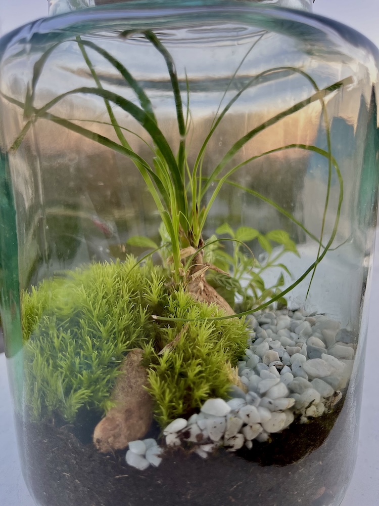Ce terrarium lumineux invite à la contemplation par sa simplicité et son équilibre naturel.