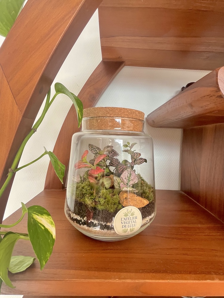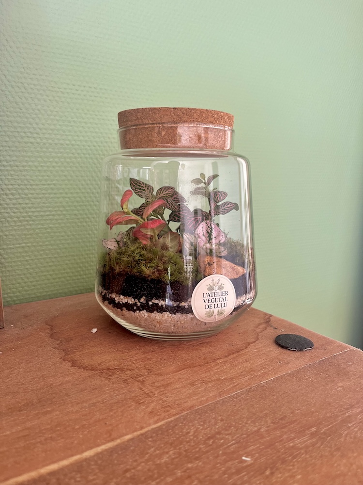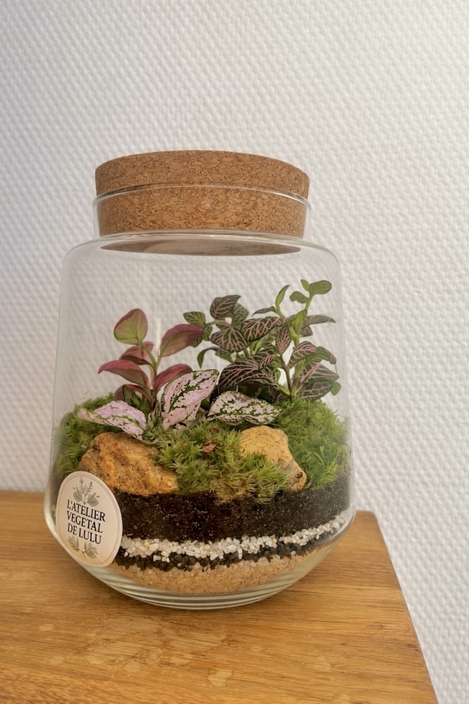 Ce terrarium joue sur les contrastes de couleurs et de textures pour créer une ambiance douce et vivante.